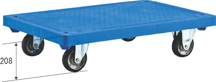外寸 900×600×208mm 耐荷重 300kg 色相 ブルー 材質 PP 出荷単位 2 積載面積 900×600mm 床高 208mm キャスター φ125×2輪自在2輪固定ゴム車 オプション バンパー
